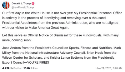 In the realm of government operations, Trump established the Department of Government Efficiency (DOGE) with the goal of streamlining federal activities, mandated a return to full-time in-person work for federal employees, froze federal hiring, and promoted a merit-based hiring system over what he described as “politically motivated criteria.” He also fired several high-profile individuals via Truth Social. “Let this serve as Official Notice of Dismissal for these four individuals, with many more, coming soon: Jose Andres from the President’s Council on Sports, Fitness and Nutrition, Mark Milley from the National Infrastructure Advisory Council, Brian Hook from the Wilson Center for Scholars, and Keisha Lance Bottoms from the President’s Export Council – YOU’RE FIRED!” Trump posted.