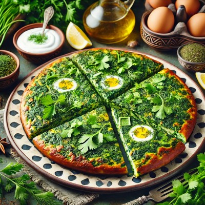Cook the Kuku Sabzi: Heat olive oil in a non-stick pan, pour in the mixture, and cook covered for 8-10 minutes until set. Flip and cook for another 5 minutes or bake at 350°F for 15 minutes.