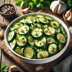 Soft zucchini, garlic, vinegar — a cool, savory side to any meal.