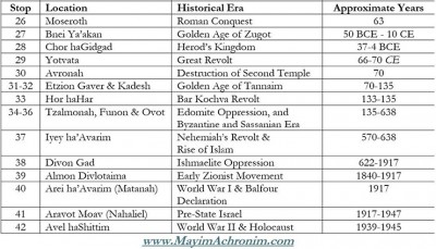 What if, I thought, the 42 stops represent a historical timeline for all the major events in Jewish history, from the Exodus to the End of Days? Could it be that the Torah was encoding all the key national “journeys” of Israel in the future? As I went through them, it made more and more sense, and a neat picture of Jewish history emerged. I decided to write about it this week instead of saving it for next year because some of the “stops” on the Israelite journey are particularly relevant now, both in light of what is happening around the world and in the Holy Land, and as we get ready to commemorate Tisha b’Av this Sunday. Let’s take a deeper look at the 42 stops of the Israelite journey.