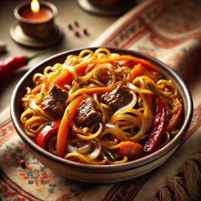 A stovetop classic — lagman noodles tossed with onions, peppers, carrots, tomato, and optional beef. Quick, filling, and full of Bukharian depth.