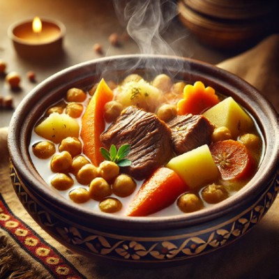 A rustic, deeply warming soup made for cold days — tender beef, root vegetables, and chickpeas simmered slowly until the broth turns golden and comforting.
