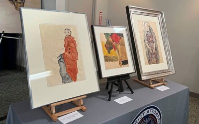 Works of art by Austrian expressionist artist Egon Schiele on display at the Manhattan District Attorney’s Office, September 20, 2023, during a ceremony returning the pieces to the heirs of Fritz Grünbaum. (AP/Bobby Caina Calvan)