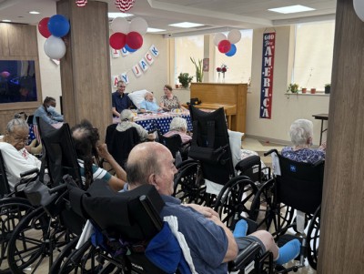 The program was beautifully curated by Ricardo Rosa Sola, Director of Recreation, who crafted a patriotic military theme in tribute to Jack’s proud service in the U.S. Navy during World War II. Red, white, and blue artwork lined the walls throughout the venue, and a large banner behind Jack proudly celebrated his 100th birthday. Atop the grand piano rested an elegant array of framed photographs—snapshots from across the decades of Jack’s remarkable life. A striking black-and-white portrait of Jack in uniform, alongside a preserved wartime letter, offered a powerful visual tribute to a life of sacrifice and service.