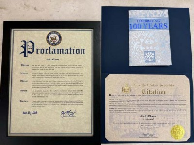 A Congressional Proclamation from Congress Member Grace Meng officially declared June 23, 2025, as “Jack Alkana Day” throughout New York’s Sixth Congressional District. The proclamation praised Jack’s enlistment at age 17, his valor aboard a bomber ship during World War II, and his decades-long career in education, culminating in his role as Principal of the Manhattan Occupational Training Center and later as a Special Education Administrator.