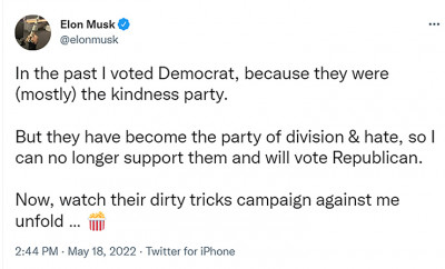 Several weeks ago, Musk tweeted that in the past he has supported Democrats because they were the “kindness” party and interested in “compassion and humanity.” He added, however, that they no longer promote those ideals, that they have become the party of “division and hate,” and that in the future he will vote Republican.