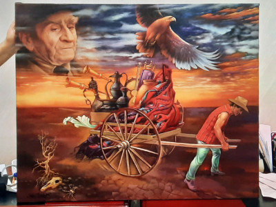 Another painting by the artist also full of deep and mystical meaning is dedicated to Aron Mikhailovich Aronov, a sage in the community of Bukharian Jews, a remarkable person and a New York-based collector of material culture and household items of Bukharian Jews. Kandinov in his composition, pushing the frame of the picture, depicts the image of the wise Aronov appearing from behind the horizon. His gaze is directed towards the center of the composition, where the artist captured the image of a young man in his trademark cowboy hat, pulling an old cart in the desert with Torah scrolls, musical instruments, carpets, and khum (a vessel for storing oil, wine, and copper utensils), etc. In the picture, the image of a mystical landscape plays a huge role, where the artist managed to convey the breath of nature merging into a single whole with the beating heart of the hero. In the center of the composition to the beat of the clatter of the cartwheels is the rhythm of flapping wings from a mighty eagle soaring in the air personifying the royal power of the Creator. In the composition, the red-orange earth is poetized by the artist with pinkish reflections of the rays of the setting sun that gilded the horizon. The sky in places has heavy blue-gray clouds, and a mosaic of colors is used for utensils and carpets on the wagon expressing the idea of harmony and unity from the Creator and His creations. The canvas is filled with hidden inner dynamism, turning it into a bright emotionally charged work expressing Kandinov’s thoughts about Aronov, a man of extraordinary spiritual beauty whose deeds the artist also sang in poetic lines, “In the desert:”