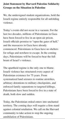 “The silence from Harvard’s leadership, so far, coupled with a vocal and widely reported student groups’ statement blaming Israel solely, has allowed Harvard to appear at best neutral towards acts of terror against the Jewish State of Israel,” he said. “I am sickened. I cannot fathom the Administration’s failure to disassociate the University and condemn this statement.”