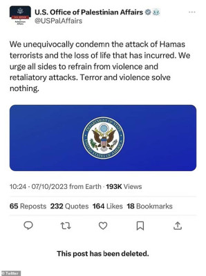 The State Department’s Office of Palestinian Affairs made the first public statement blunder. “We unequivocally condemn the attack of Hamas terrorists and the loss of life that has incurred,” they wrote on X. “We urge all sides to refrain from violence and retaliatory attacks. Terror and violence solve nothing.” This post was made while Hamas terrorists were killing concert goers and kidnapping women and children. Senator Ted Cruz reacted strongly to this, saying, “This is disgraceful, and every single person involved in drafting and approving this tweet should be immediately expelled from the US government.” The post was quickly deleted.