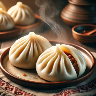 Oversized dumplings filled with meat and onion, steamed until tender — a centerpiece winter meal.