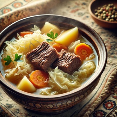 A hearty soup built for cold days, using cabbage — a staple winter vegetable in Bukharian homes.