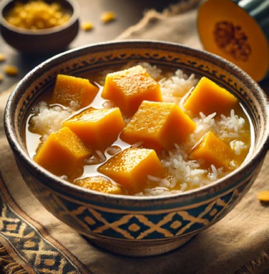 A softly simmered winter stew where pumpkin melts gently into rice and onions, creating a naturally comforting dish that warms from the inside out.