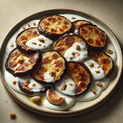 Soft, pan-cooked eggplant topped with garlic yogurt — rich, warming, and ideal with fresh bread. Golden eggplant and garlic yogurt — simple, warming, and deeply Bukharian.