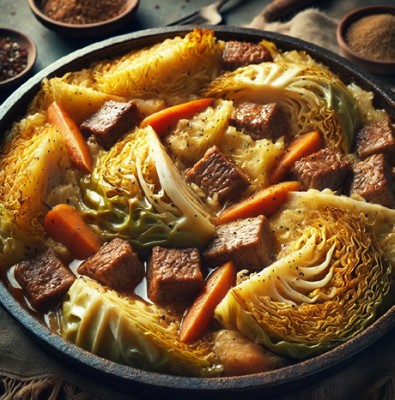 Large cabbage wedges layered with beef and carrots, cooked slowly until tender and lightly caramelized. Slow-braised cabbage and beef — hearty, warming, and deeply comforting.