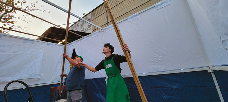 Staff at Masbia of Queens built a sukkah to feed the needy during Sukkot, in addition to take-home raw grocery packages and take-home cooked Shabbat