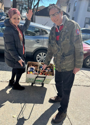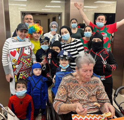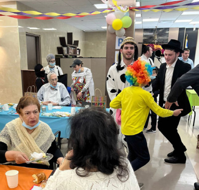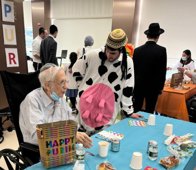 Rabbi Eliezer Feder, Project Manager, Office of Student Life at Lander College for Men / Beis Medrash L’Talmud, was invited to bring a group of his yeshivah bachurim to provide a freilich and uplifting environment for the Purim afternoon entertainment. The program began at noon as the collegiate young men enthusiastically danced with residents to the enthusiastic singing and keyboard selections of Tzvi Bennett, son of Dr. Ellie and Sarale Bennett, an up-and-coming one-man band based out of Kew Gardens Hills. With holiday tunes in the air amid the cheerful décor, neighborhood families connected to the wonderful Queens Chesed Program brought along adorable children dressed in costumes to distribute 100 mishloach manos for residents. Thanks is extended to the Danesh, Gavrielov, Gurgov, London, Niyazov, and Pinhasov families for bringing the Margaret Tietz Purim experience to new heights. Many brought along their bright smiling children, a pivotal part of the Purim experience, who gladly assisted in passing out the gift packages with warm open arms. Their delightful Purim costumes – from Waldo and Spiderman to police officers, a clown, a playing card, and even a cow – brought much needed relief to the residents who were seemingly reliving formative experiences of these Jewish customs. Izzy Root, as has become tradition, brought along another 100 mishloach manos prepared by Queens and 5 Towns volunteer. For upwards of an hour, BZ and his fellow LCM peers excitedly danced in joyful circles amongst the residents successfully bringing forth the essence of the chag in a frelich and respectable fashion.