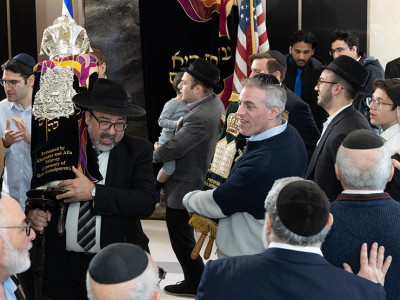 Alex and his family added the final letter to the scroll, making it a complete Torah with lineage straight back to Moshe Rabbeinu at Hat Sinai. The sofer brought Benjamin Solovey close to watch the final lamed written, and then amidst joyous song, lifted the Torah towards the heavens for the Torah’s first hagbah. The music of Pumpidisa kept a celebratory mood all morning and culminated their presentation with lively tunes that brought the Torah to its home in the shul’s holy ark. Riverside Caterers provided a lavish seudah of creative cuisine that combined both the Ashkenazic and Sephardic pallets of the guests making for a delicious experience.