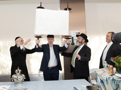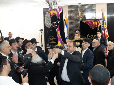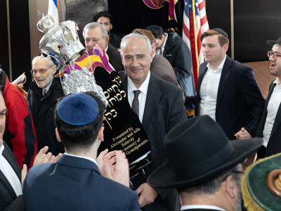 The tasteful shul and Torah were dedicated in memory of Izik Shamalov z”l, the father of Mrs. Solovey and her brother Michael. The dedication also commemorated the memories of their grandparents, Mishoel Shamalov z”l, Bertha Gavrielova Shamalov a”h, Roza Shoshana Shimanov a”h, and Yadgar Shimanov z”l, in addition to Alex’s grandparents Mania Kopyt a”h, Naftali Kopyt z”l, Dinah Solovey a”h, and Zamund Solovey z”l. The family, including Michael and Milana Shamalov, Tatyana Shamalov, Viola Krivitsky, and Sam Shamalov, joined in the festivities.