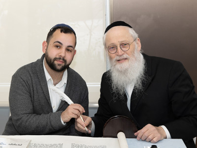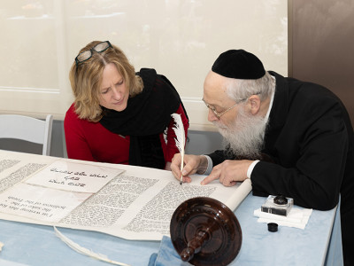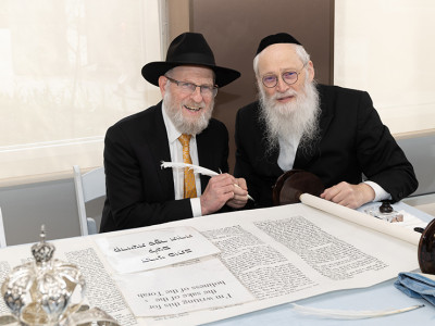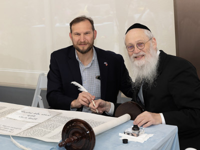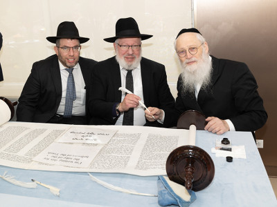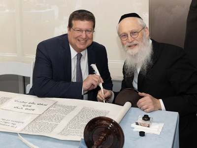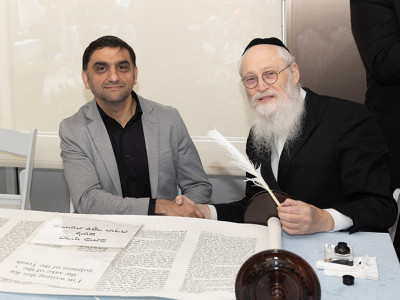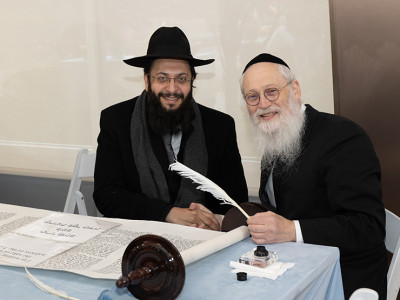 “Many well-intentioned Jews throughout the world donate their funds to keep Judaism strong. Some build museums, erect monuments, or sponsor chairs at colleges, but you, Alex understood the greatest dedication that one can make,” expressed the Queens Senior Chabad emissary. “In the words of the great Rav Saadia Gaon, ‘What makes us a People is our Torah; that is the greatest dedication that a person can make.’” Pointing to the table where sofer Rabbi Moshe Klein led the completion, Rabbi Blesofsky stated, “The Torah on that table is not just an ancient message written on parchment. Rather, it is divrei elokim chayim, eternal words of a living G-d. It is the divine Constitution that guides and inspires our People throughout the world.” The Chairman of the local Council of Shluchim posed the query, “What else unites a Jew from Moscow and a Jew from Jamaica, or a Jew from France to a Jew from Australia? It is our Torah that unites us, not our matzah ball soup, nor our culture, not our chopped liver, but the Holy Torah.” The rabbi echoed the words of King Solomon, explaining that the Torah is a tree of life to those who cleave to it and called its supporters “tomchei Torah.”