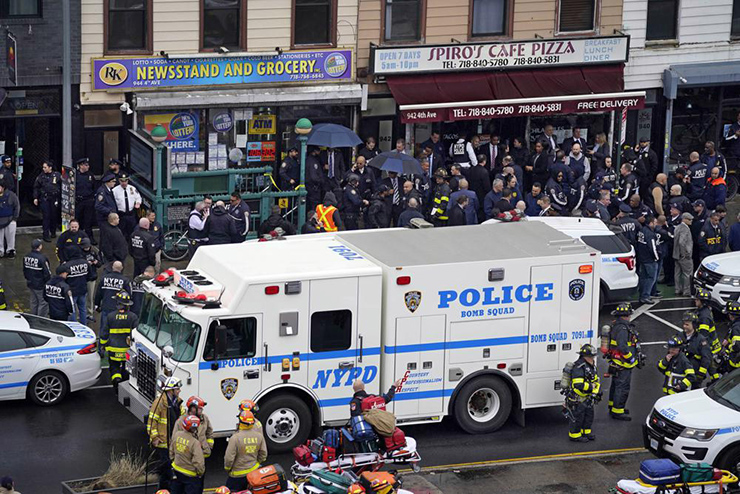 A gunman in a construction vest donned a gas mask, set off a smoke canister on a rush-hour subway train and shot at least 10 people Tuesday morning, authorities said. The shooter was at large after leaving wounded commuters bleeding on a Brooklyn platform while others ran screaming.