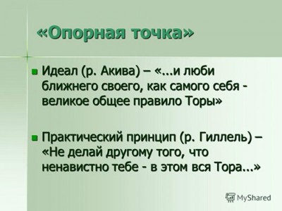 центровое место принадлежит заповеди о соблюдении субботы, тогда как третьи отдают предпочтение идее – «Люби ближнего, как самого себя...» Убежденным сторонником этого утверждения выступал знаменитый раббай Акива, что нашло отражение в «Иерусалимском Талмуде» в виде его известного классического выражения – «Фундаментальный принцип Торы».