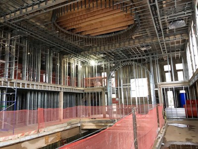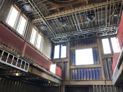 Несколько дней назад я в очередной раз переступил порог стройки, побродил по этажам, задрав ввысь голову, подолгу оценивающе, с вниманием присматривался к происходящим здесь разительным изменениям. Картина представлялась внушительная: все без исключения стены от нижнего этажа (там, где по проекту будет красоваться величественный зал ресторана с высокими потолками) до крыши, оделись в металлические рейки, предназначенные для скорой установки и крепления специального отделочного покрытия – щитрака. На лицо приближающийся этап завершающихся работ, что наглядно подтверждает – дело явно спорится.