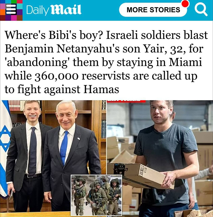 Как сообщалось под фотографией, Яир Нетаниягу не захотел возвращаться на родину после нападения боевиков 7 октября и воевать против ХАМАС, а